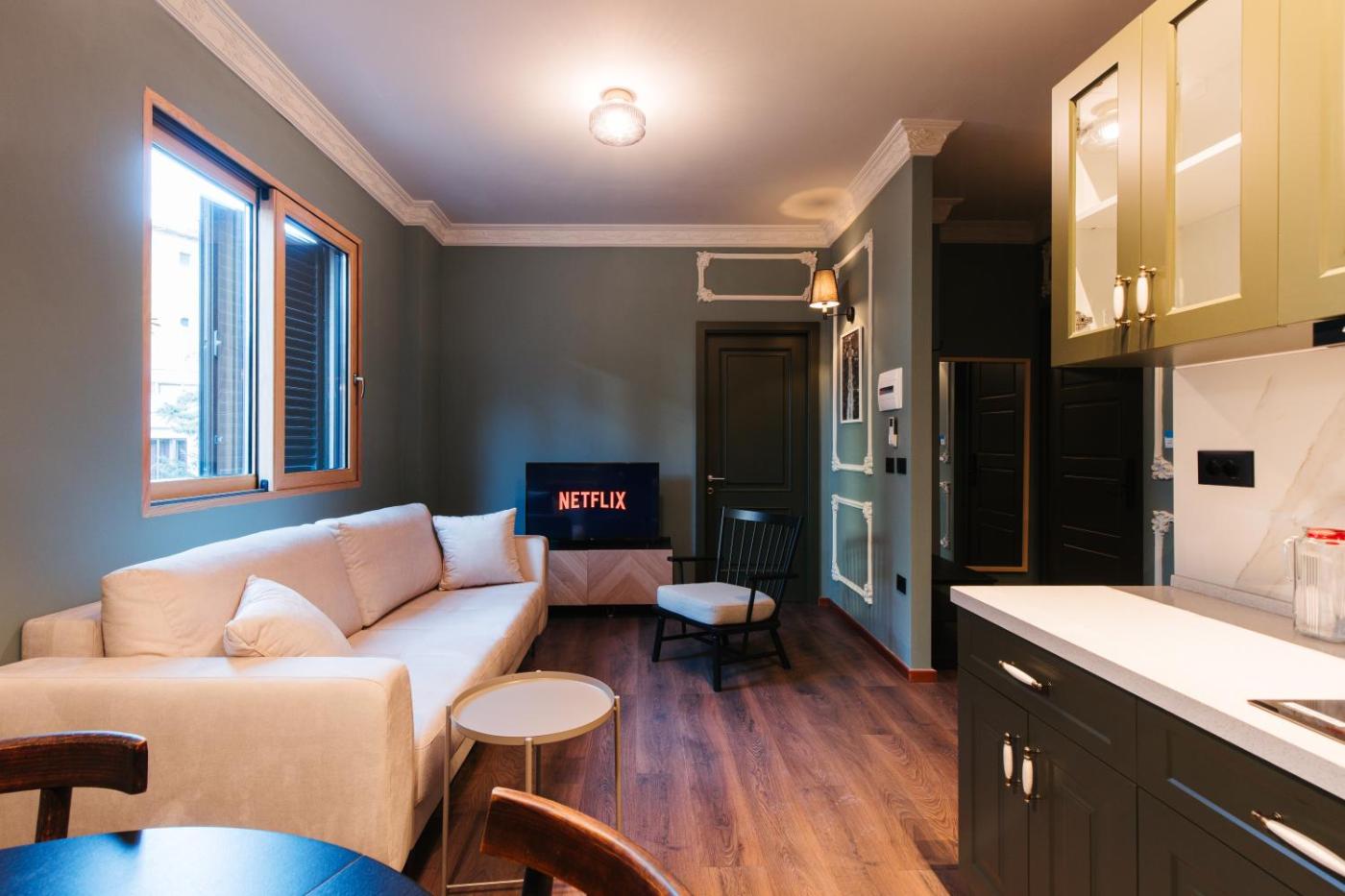 One-Bedroom Apartment. This air-conditioned apartment comes with 1 living room, 1 separate bedroom and 1 bathroom with a bath. The apartments kitchenette is available for cooking and storing food. The apartment has parquet floors, a seating area with a flat-screen TV with streaming services, a wardrobe, a sofa, as well as heating. The unit has 2 beds.